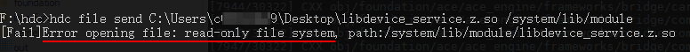FAQ传文件报错read-only-file-system本页总览传文件报错read-only file system 问题描述 解决方案 问题描述 执行file send命令将文件传送至测试机上时,出现如下报错信息: [Fail]Error opening file: read-only file system, path:*** 解决方案 由报错信息可以看出,无法传输文件是因为权限限制,因此您需要先获取读写权限。执行hdc命令获取读取权限。 hdc shell mount -o rw,remount /
