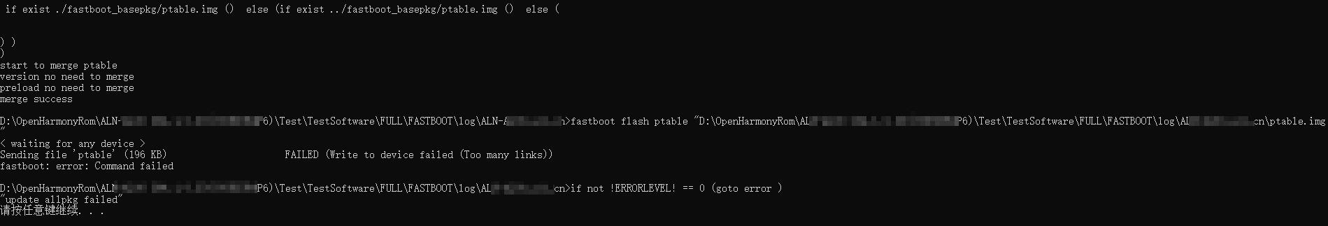 FAQ进入Fastbots模式报错FAILED-Write-device-failed-Too-many-links本页总览进入Fastbots模式报错FAILED Write device failed Too many links 问题描述 解决方案 问题描述 Mate 60型号的测试机进入Fastbots模式出现如下报错信息: 解决方案 执行一次update_allpkg.bat,若还是出现上述报错信息,请再执行一次update_allpkg.bat。