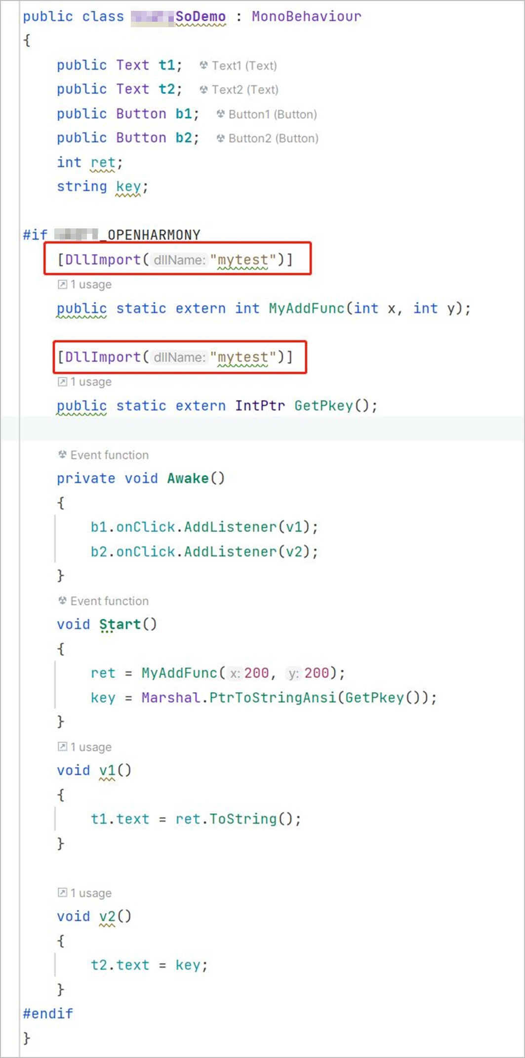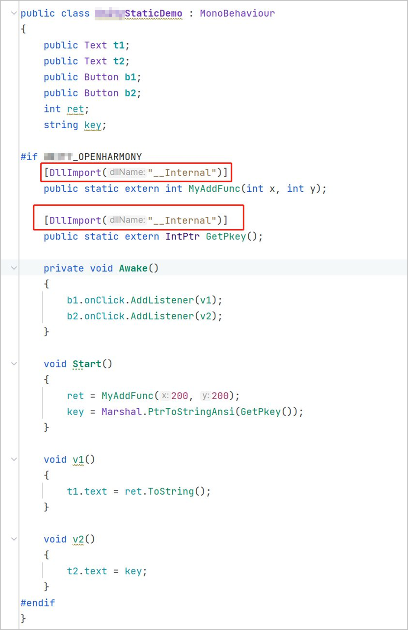 代码中使用**[DllImport("__Internal")]**调用静态库,例如示例代码中,MyAddFunc()和GetpKey()为静态文件中的接口函数。