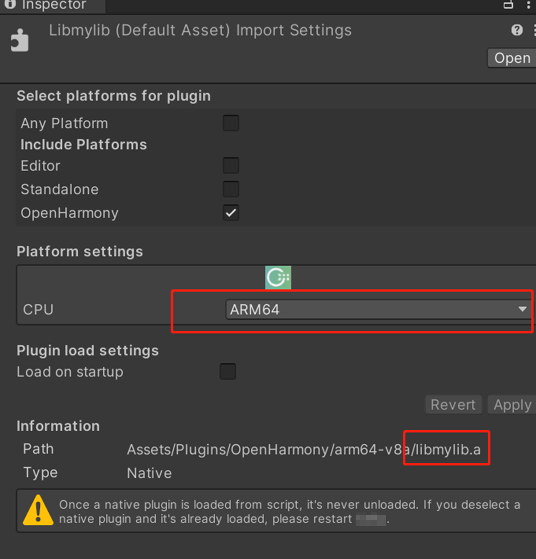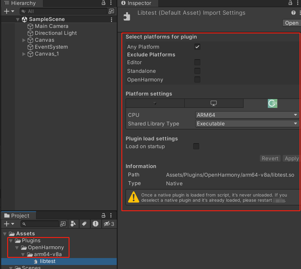 使用C#调用.a静态库文件和.so动态库文件前,均需把文件放置到Asset/Plugins/OpenHarmony/arm64-v8a(armeabi-v7a)路径下,具体操作步骤如下: