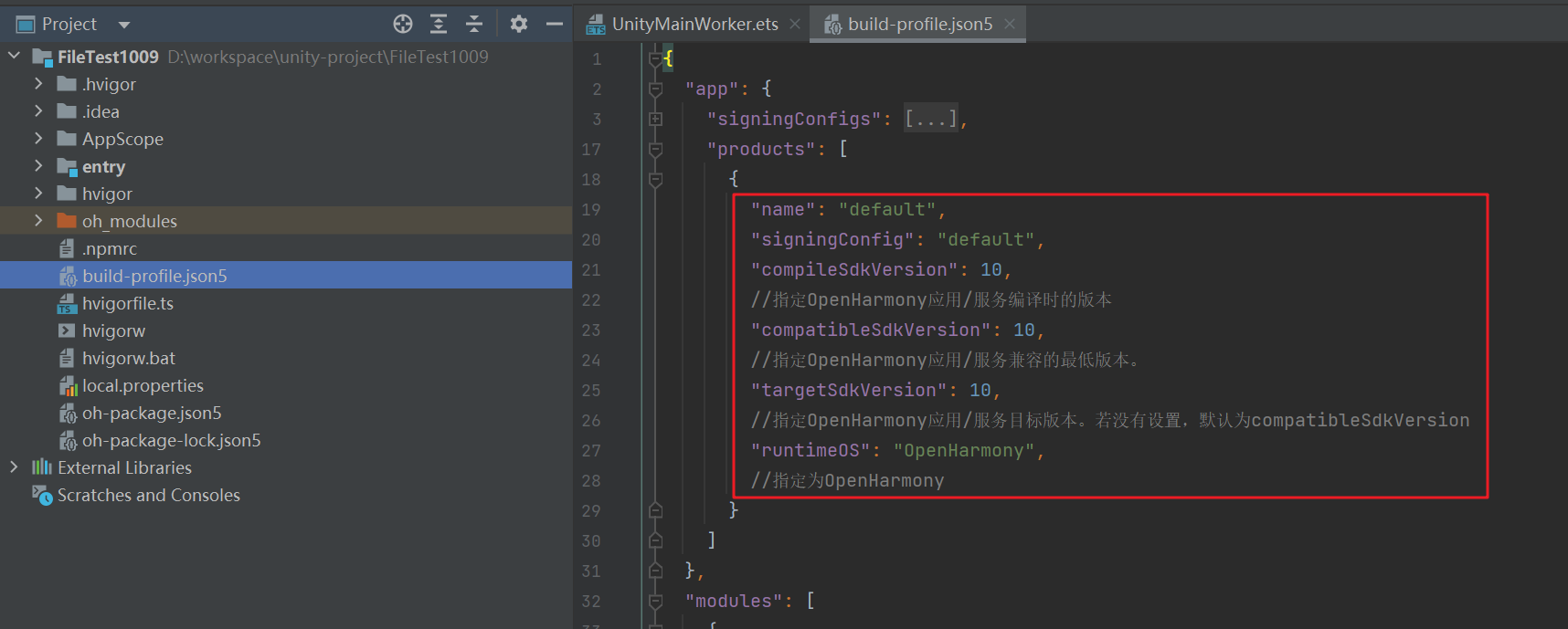 在DevEco Studio中修改项目级build-profile.json5配置文件。将app下products字段修改为如下所示: